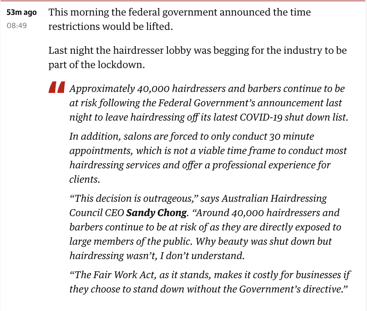 If we move beyond the hairdresser debacle to the broader question of an extreme lockdown we also see a Federal Government whose misguided dragging-of-feet on their pandemic response is shaping up to drag the whole crisis out much longer than necessary, significantly harming business.