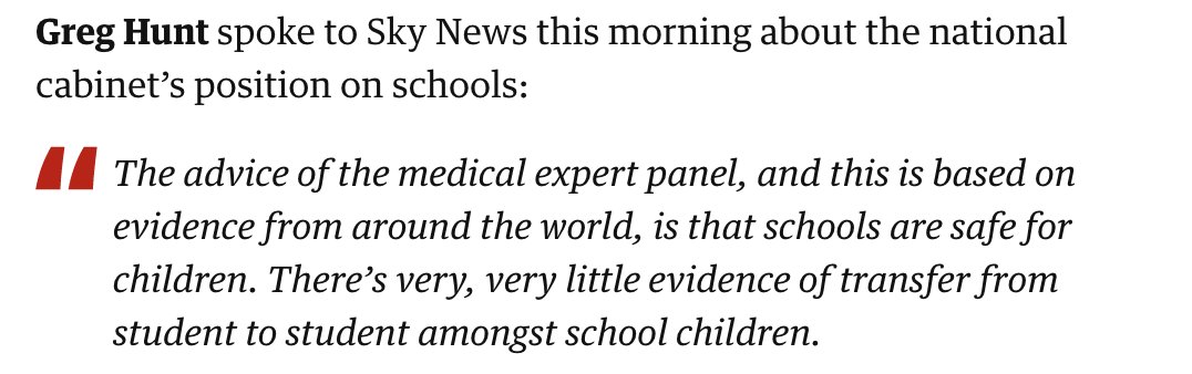 Let's illustrate the problem with just two sentences from a recent Sky interview the Health Minister Greg Hunt gave, where he justified the pet theory of Australia's national cabinet, that 'schools are safe':